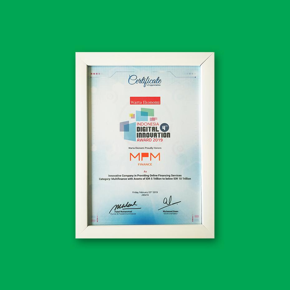 Perseroan raih penghargaan sebagai Innovative Company in Providing Digital Services for category Multifinance Company with Total Asset of IDR 5 Trillion to IDR 10 Trillion dalam ajang Indonesia Digital Innovation Award 2019 yang diselenggarakan oleh Majalah Warta Ekonomi