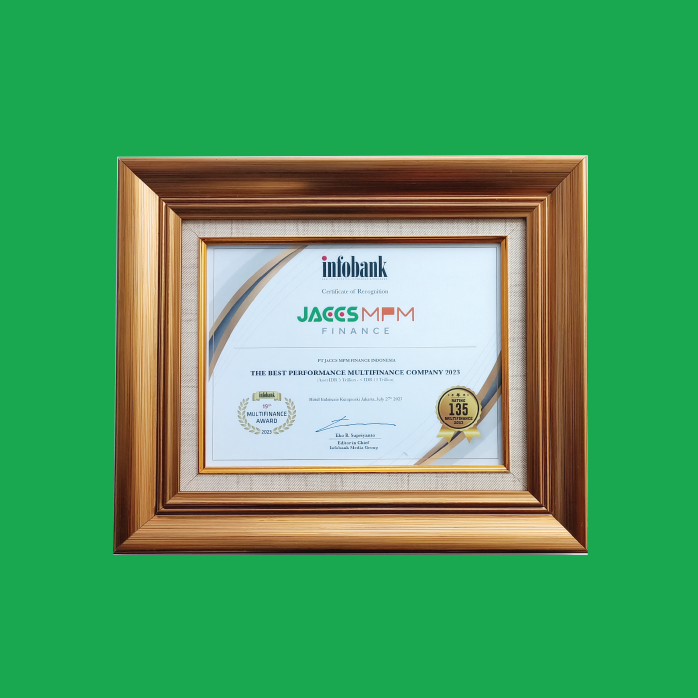 Pada Tanggal 27 Juli 2023, JACCS MPM Finance Indonesia menerima Certificate of Recognition dari Infobank sebagai "The Best Performance Multifinance Company 2023" (Asset IDR 5 Trillion - < IDR 10 Trillion) di Acara 19th Multifinance Award 2023.