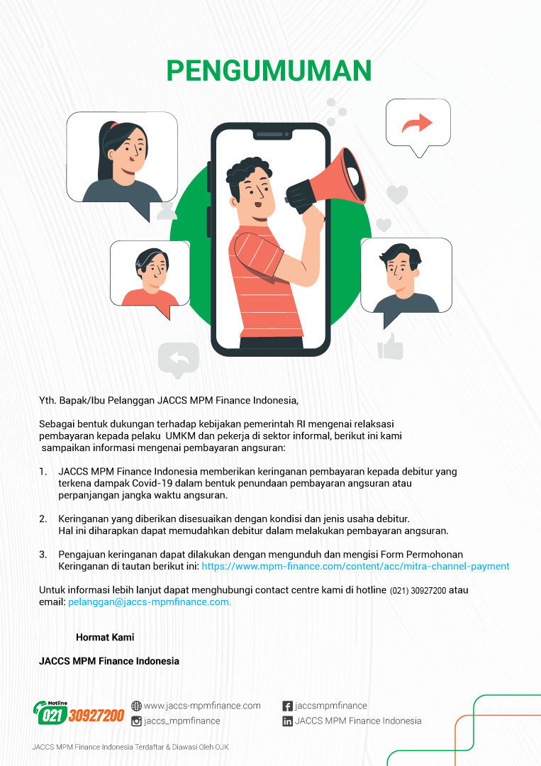 Sebagai bentuk kepedulian kami atas wabah yang terjadi dan sejalan dengan arahan Otoritas Jasa Keuangan, JACCS MPM Finance Indonesia bersama ini menyampaikan kebijakan keringanan pembiayaan kepada Bapak/Ibu yang mengalami dampak penyebaran Covid-19: